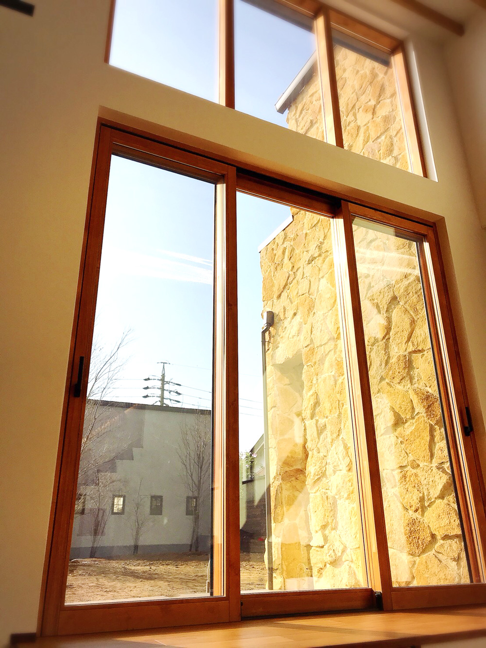 2017年12月 木製サッシ複合サッシ へーべシーベスクールウィンドウドレーキップテラスドア玄関ドアフィックス N邸 樹種 能登ヒバ へーべシーベ 両袖引込み ※上部はフィックス 設計 株式会社ワイズフォルマ 様 施工 株式会社ワイズフォルマ 様